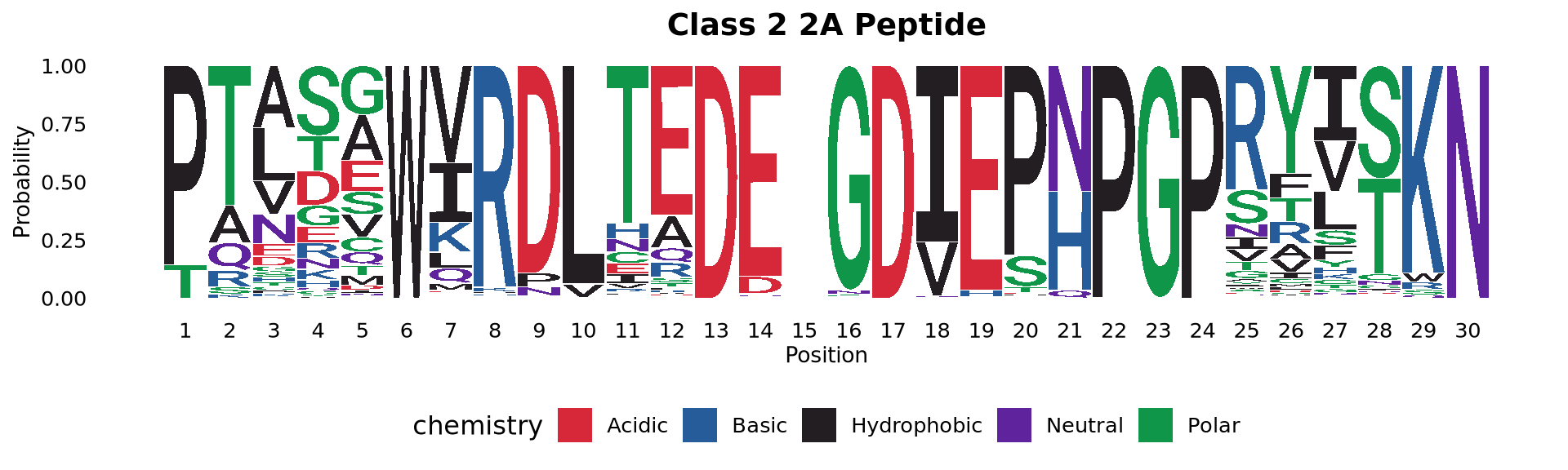 Figure 2: Class 2 2A peptide sequence logo showing conserved N-terminal tryptophan, EEGIE central motif, and PNPGP C-terminal motif