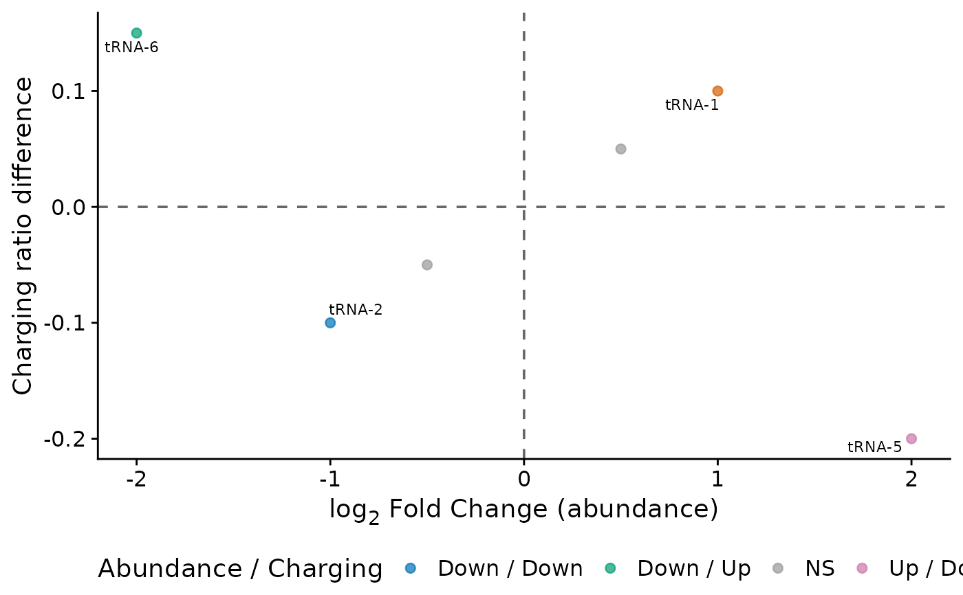 Creates a scatter plot comparing tRNA abundance changes (from DESeq2)