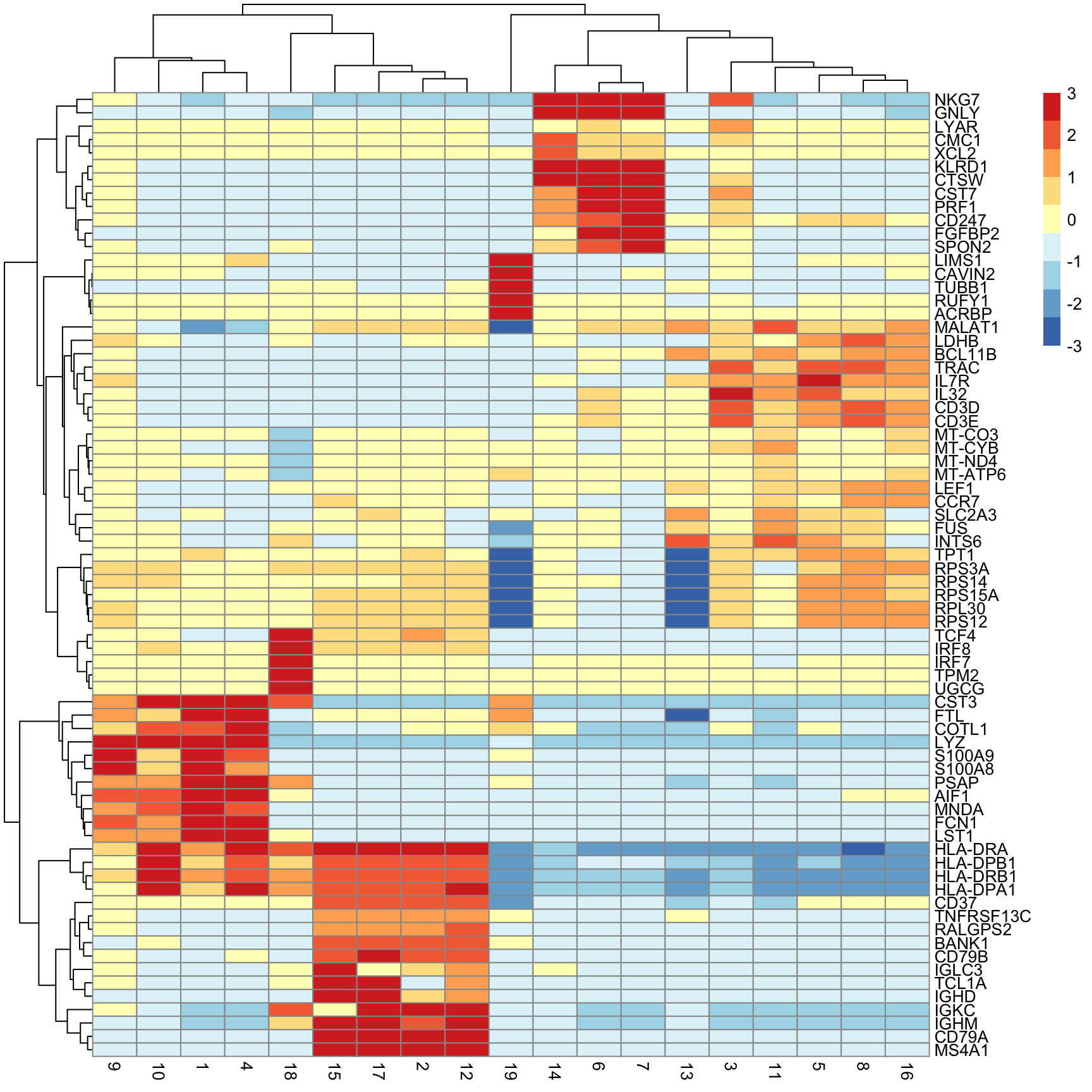 Next we will extract the top N markers from each cluster, ranked on mean.AUC, then plot the average expression of these markers in each cluster as a heatmap.