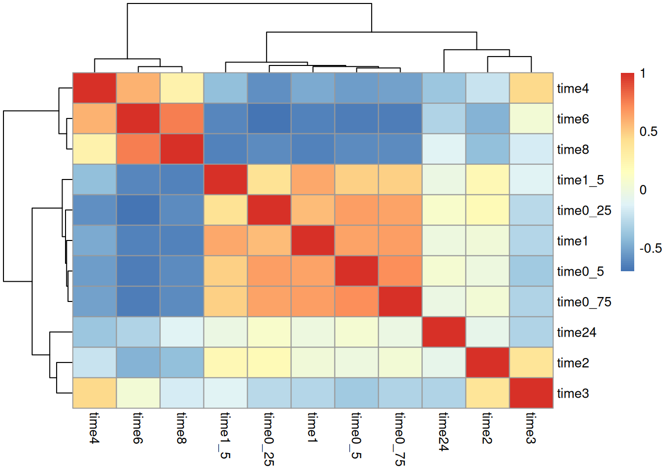 Timepoints close to each other tend to correlate strongly with each other. The 4,6, and 8 hr time points are the most different from all others.
