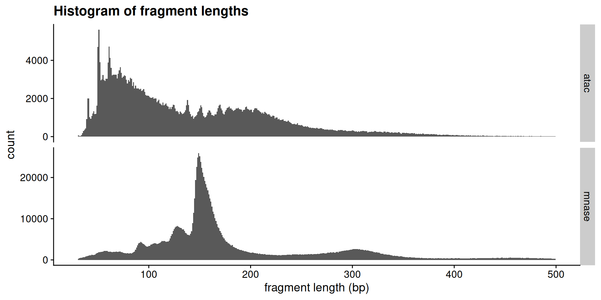 Let’s remind ourselves of the expectations for chromatin fragment lengths from MNase-seq and ATAC-seq experiments.