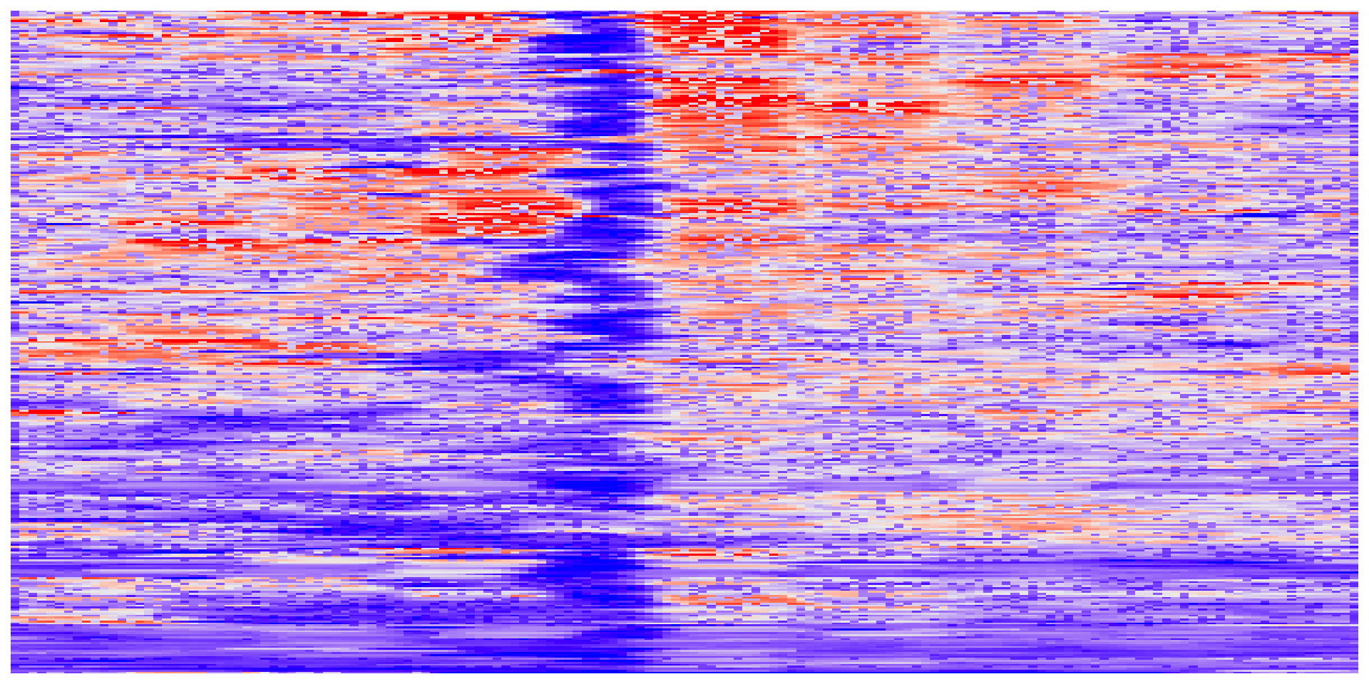 For larger features like nucleosome positions or chromatin domains, you might set up larger windows (~200 bp) at distances up to ~10 kbp up- and downstream of a set of reference points.