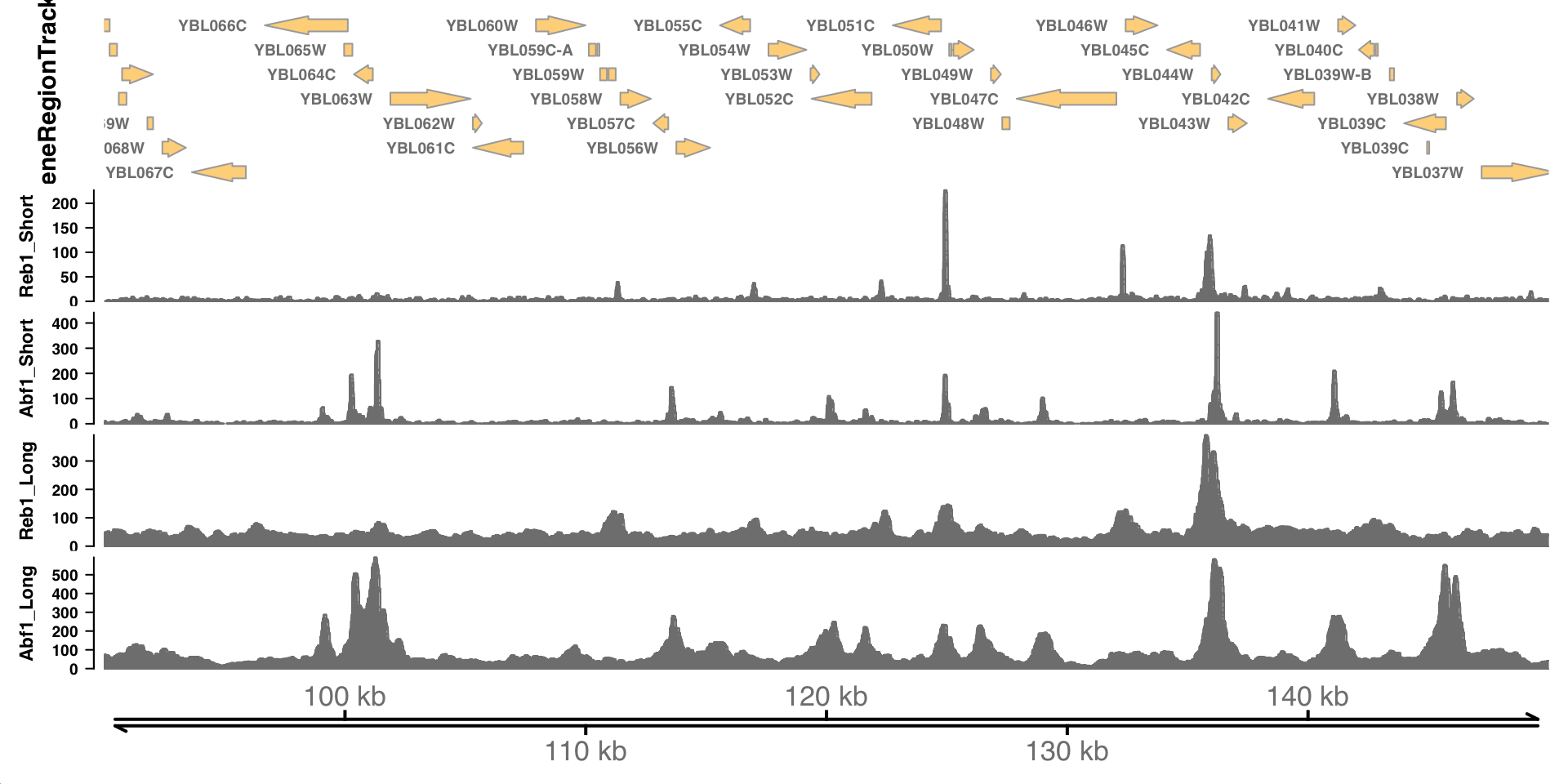 I selected the 16 second time point for S. cerevisiae Abf1 and Reb1 (note the paper combined data from the 1-32 second time points).