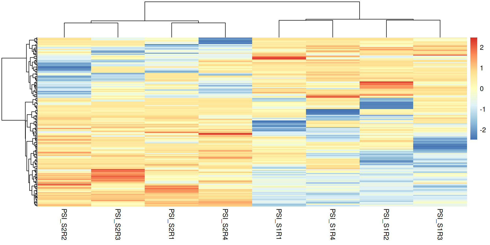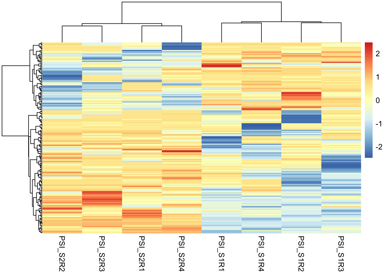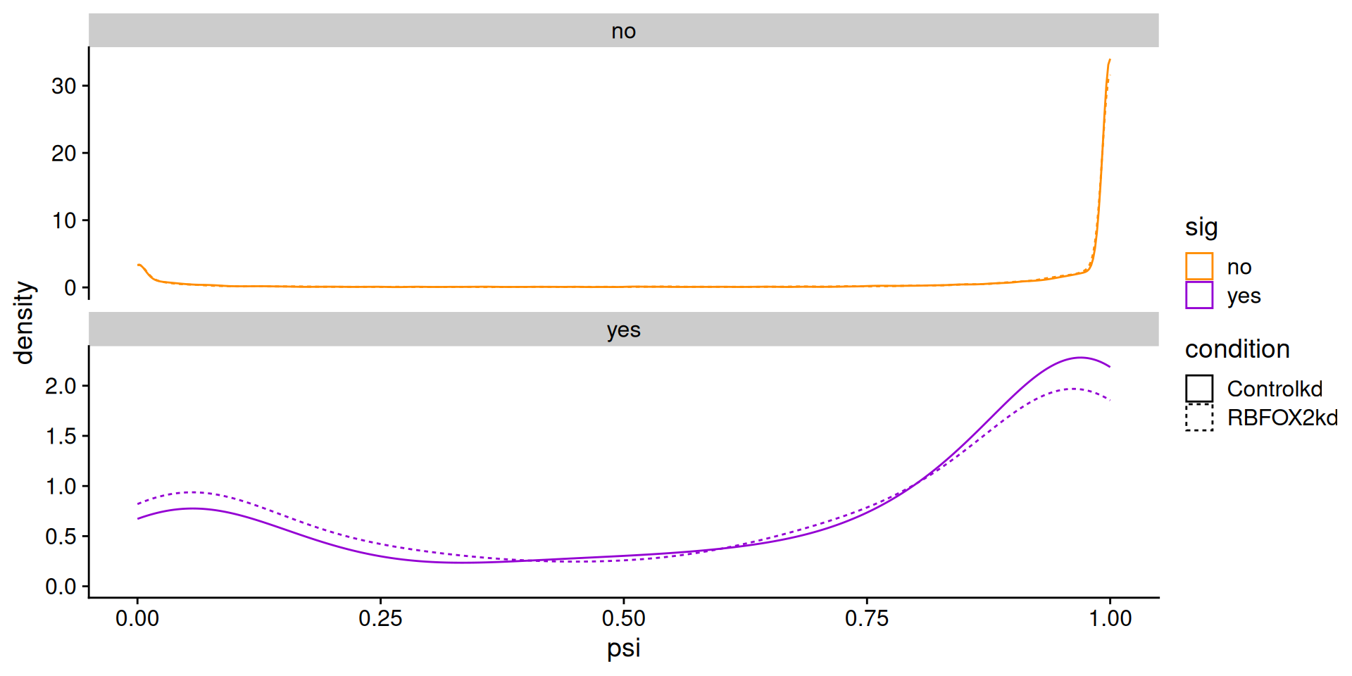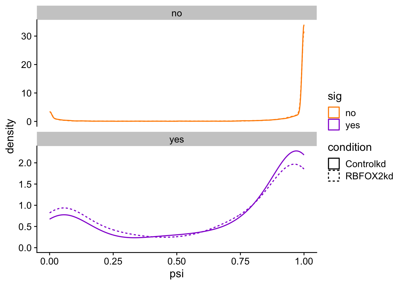 psis_filt_psi <- psis_filt |>separate_wider_delim(col = IncLevel1,delim =",",names =c("PSI_S1R1", "PSI_S1R2", "PSI_S1R3", "PSI_S1R4") ) |>separate_wider_delim(col = IncLevel2,delim =",",names =c("PSI_S2R1", "PSI_S2R2", "PSI_S2R3", "PSI_S2R4") ) |>select(contains("PSI"), FDR) |>mutate(across(starts_with("PSI"), as.numeric))# Turn data from wide format into long format for plotting purposespsis_filt_psi_long <- psis_filt_psi |>pivot_longer(cols = PSI_S1R1:PSI_S2R4,names_to ="sample",values_to ="psi" ) |>mutate(condition =if_else(str_detect(sample, "S1"), "RBFOX2kd", "Controlkd"),sig =if_else(FDR <0.05, "yes", "no") )